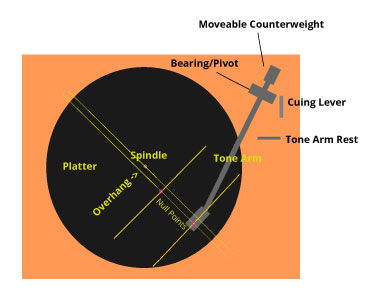 - Overhang: This refers to the small distance the stylus extends past the center spindle diameter line. This is done so the tonearm traces an arc across the records' grooved area with the least possible angular misalignment. This distance is specific to each turntable, and is usually adjusted with the aid of a gauge with alignment marks drawn on it. The stylus is really only perfectly aligned in two spots on the record. These are called the null points, which should be marked on the setup gauge.