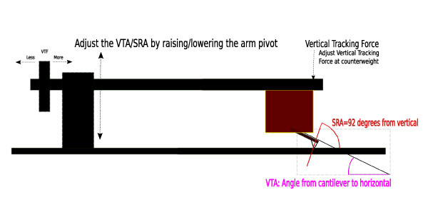 - SRA and VTA: Here are two often misunderstood parameters that drive audiophiles to panic; Stylus Rake Angle, and Vertical Tracking Angle. In the diagram below, pay specific attention to Stylus Rake Angle above all else. This should be about 92 degrees, to match the angle of the cutting head used to make the recording. Most manufacturers advise to begin with the tonearm level to the record surface, hoping that will work well enough. On elliptical and high-end fine-line and Shibata styli, SRA is more critical to achieving the performance potential of the cartridge. VTA is tied to SRA, and is adjusted in most cases by raising or lowering the rear of the tonearm until the best sound is achieved. If you have access to a microscope, this can be useful to verify the actual angle of the stylus versus adjusting by ear.