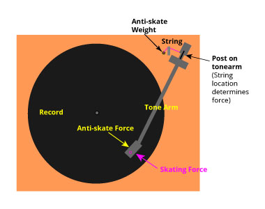 - Anti-Skating, or Horizontal Tracking Force (HTF): This adjustment is needed on pivoted tonearms to counteract the tendency for the stylus to “skate” across the record surface. This tendency causes the stylus to favor the innermost groove if not compensated for. Many turntables use a small weight on a string to supply the counter-force to the tonearm. Some turntables use sophisticated dials and springs, and others use magnets to achieve this, while some tables have no means of adjustment at all. Proper adjustment (even side-to-side pressure on both groove walls) can be verified with a test record with highly-modulated grooves that will torture-test the stylus until distortion is heard from one channel or the other. Proper anti-skate will result in both channels distorting at the same time.